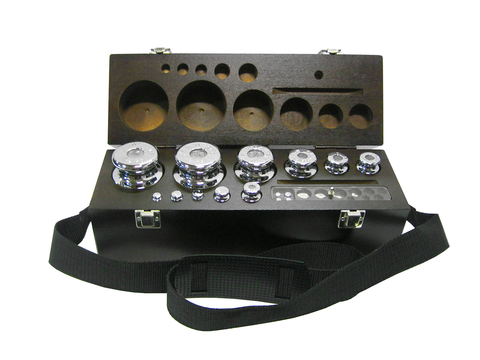 Pesiera in legno con frazioni lamellari e pesi cilindrici MEC da 1 mg a 10 kg, conformi alle raccomandazioni OIML.